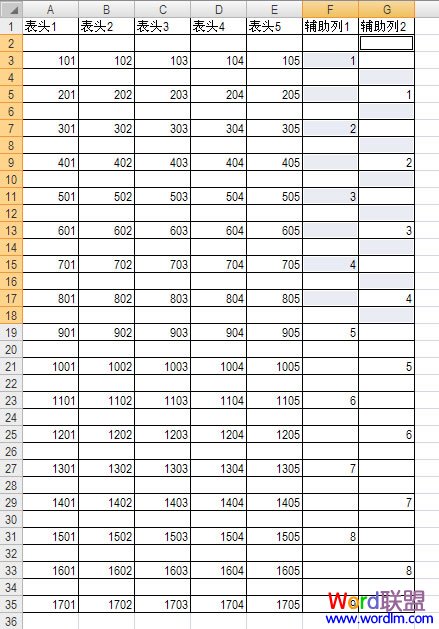 第一步:增加两个辅助列,按下图填入数字或文本;